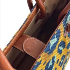 - Bolso tipo tote en fibra textil estampado animal print y cuero grabado dorado.