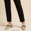 - Zapato destalonado (mules) fabricado en fibra textil y cuero de aspecto suave, punta semi ovalada.