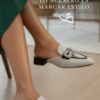 - Zapato destalonado (mules) fabricado en fibra textil y cuero de aspecto suave, punta semi ovalada.